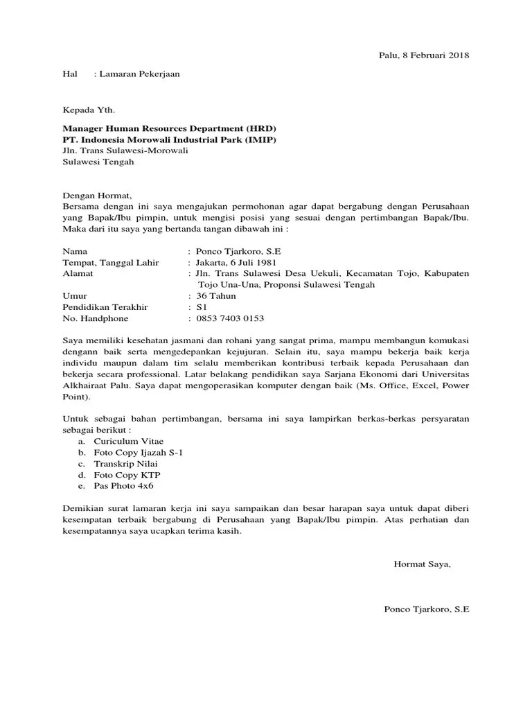 Dengan ini saya mengirim surat lamaran pekerjaan di perusahaan yang anda pimpin berdasarkan lowongan yang ada di surat kabar. Bank negara indonesia (persero) tbk wisma bni 46, jl. Hrrecruitment@imip.co.id pelamar dari sulawesi : Muhammad jufri morowali 8 months ago. Berfikir positif, pantang menyerah, kerja keras dan berkomitmen menjalani pekerjaan di kawasan pt. Besar harapan saya untuk dapat diterima bekerja pada perusahaan bapak. Menulis surat lamaran pekerjaan haruslah tertata dan juga baku. Dalam contoh surat lamaran kerja agar mudah diterima hobi menjadi salah satu hal yang bisa dijadikan daya tarik lain. Kabupaten morowali memiliki potensi sumber daya nikel yang cukup besar sehingga punya prospek untuk mengembangkan industri misi yang diemban pt imip dalam menjaga operasi secara berkelanjutan (sustainable) dan dalam mengembangkan kawasan industri, adalah Lamaran diantar langsung ke kantor pt imip. Surat lamaran kerja adalah surat yang digunakan untuk melakukan permohonan mendapatkan pekerjaan sesuai pengalaman pada perusahaan tertentu. Baik itu yang baru lulus (fresh graduate) dan berencana mencari pekerjaan. Saya sangat antusias melampirkan resume untuk menjadi bahan pertimbangan.